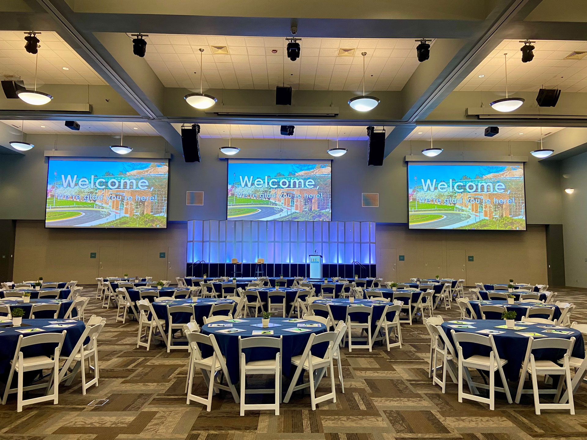 The fully carpeted space is equipped with a loading dock, three projectors and screens, concert-quality sound, digital 32-channel soundboard, professional lighting, power outlets in the floor, 24′ ceiling height, and multiple space configurations to accommodate various event sizes. The Grand Hall is 13,000 square feet.